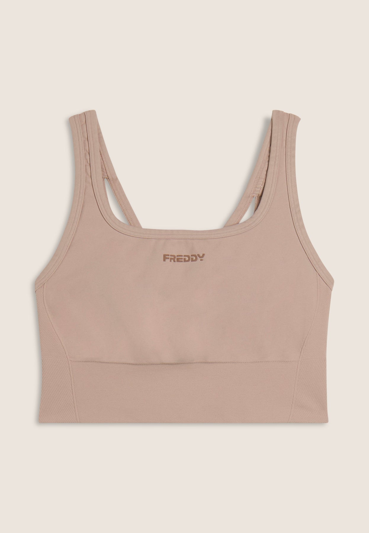 De uitneembare, voorgevormde cups geven extra vorm en ondersteuning, terwijl de nylon jersey stof ademend en duurzaam is — ideaal voor elke workout, van yoga tot fitness.