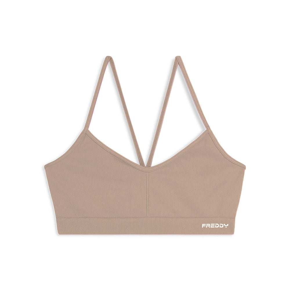 Het ontwerp heeft een brede halslijn en dunne gekruiste bandjes op de rug, wat zorgt voor een vrouwelijke en sportieve uitstraling. De elastische onderband met een subtiel FREDDY jacquard logo biedt extra ondersteuning en een stijlvolle afwerking.