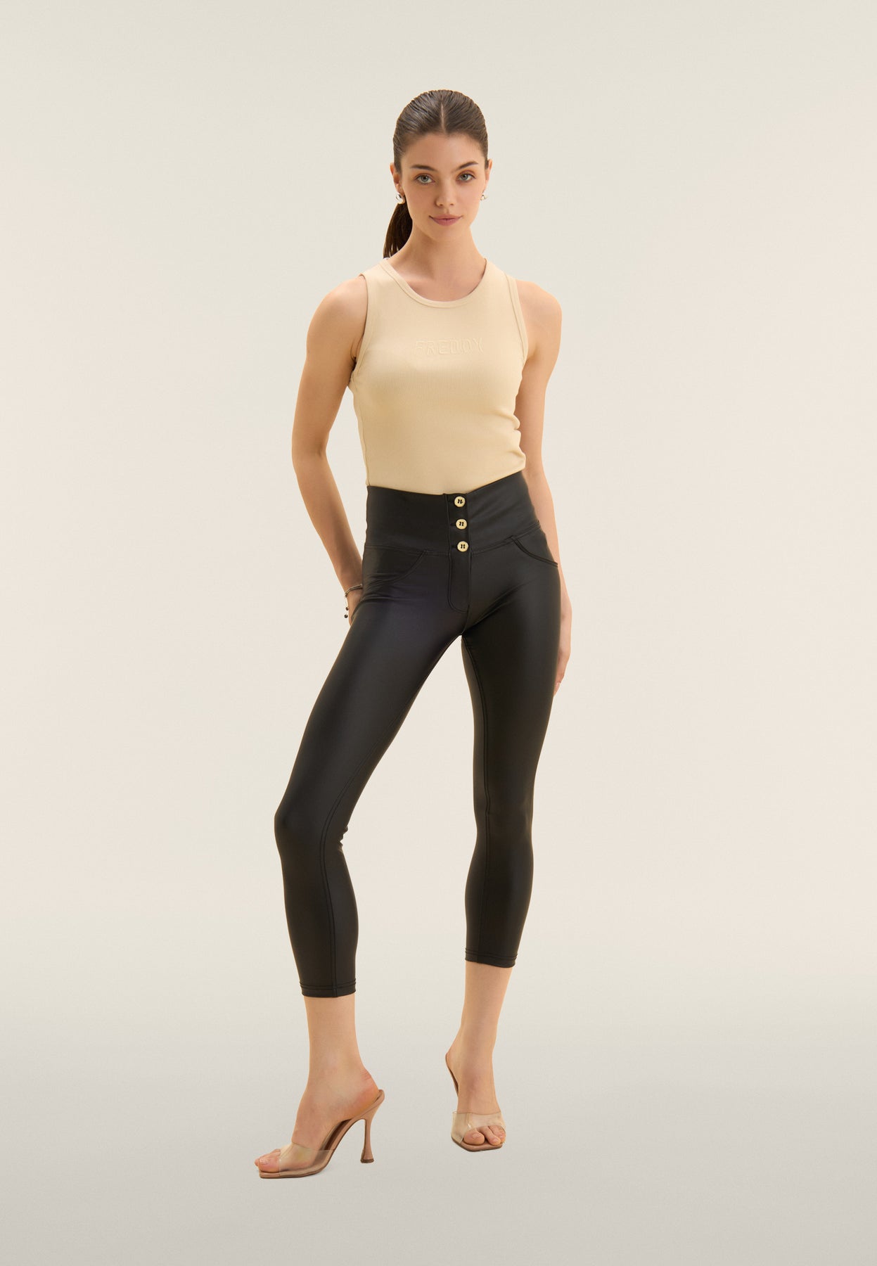 This WR.UP® mid waist design has the look of genuine leather with the advantage of sleek, comfortable fit. It features a push up for added support and shaping, accentuated by a stylish 3-button closure. Enhance your style with this stylish and functional leather look!