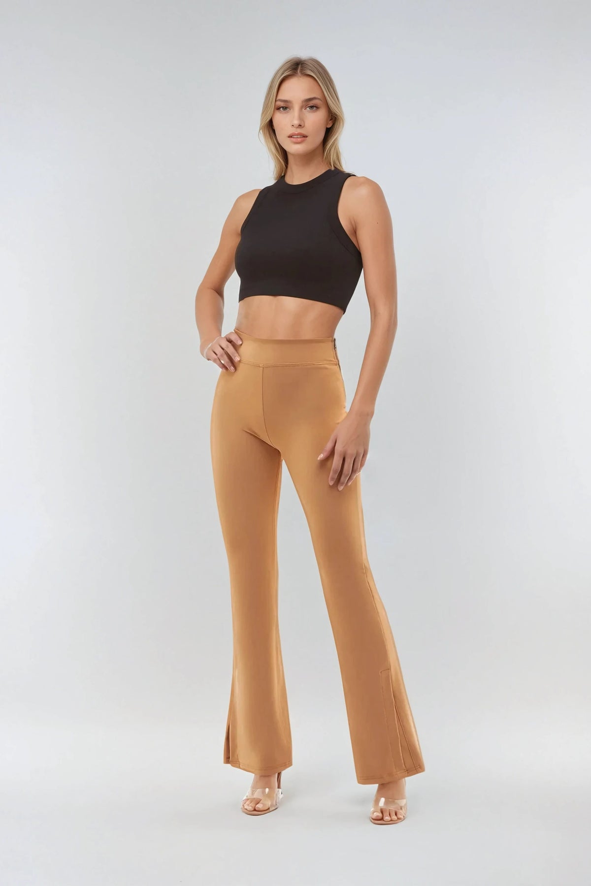 De wijde pijp geeft een elegante, vrouwelijke uitstraling, terwijl de split aan de enkel zorgt voor een speelse en moderne twist. Perfect te dragen met hakken of sneakers, afhankelijk van je look.