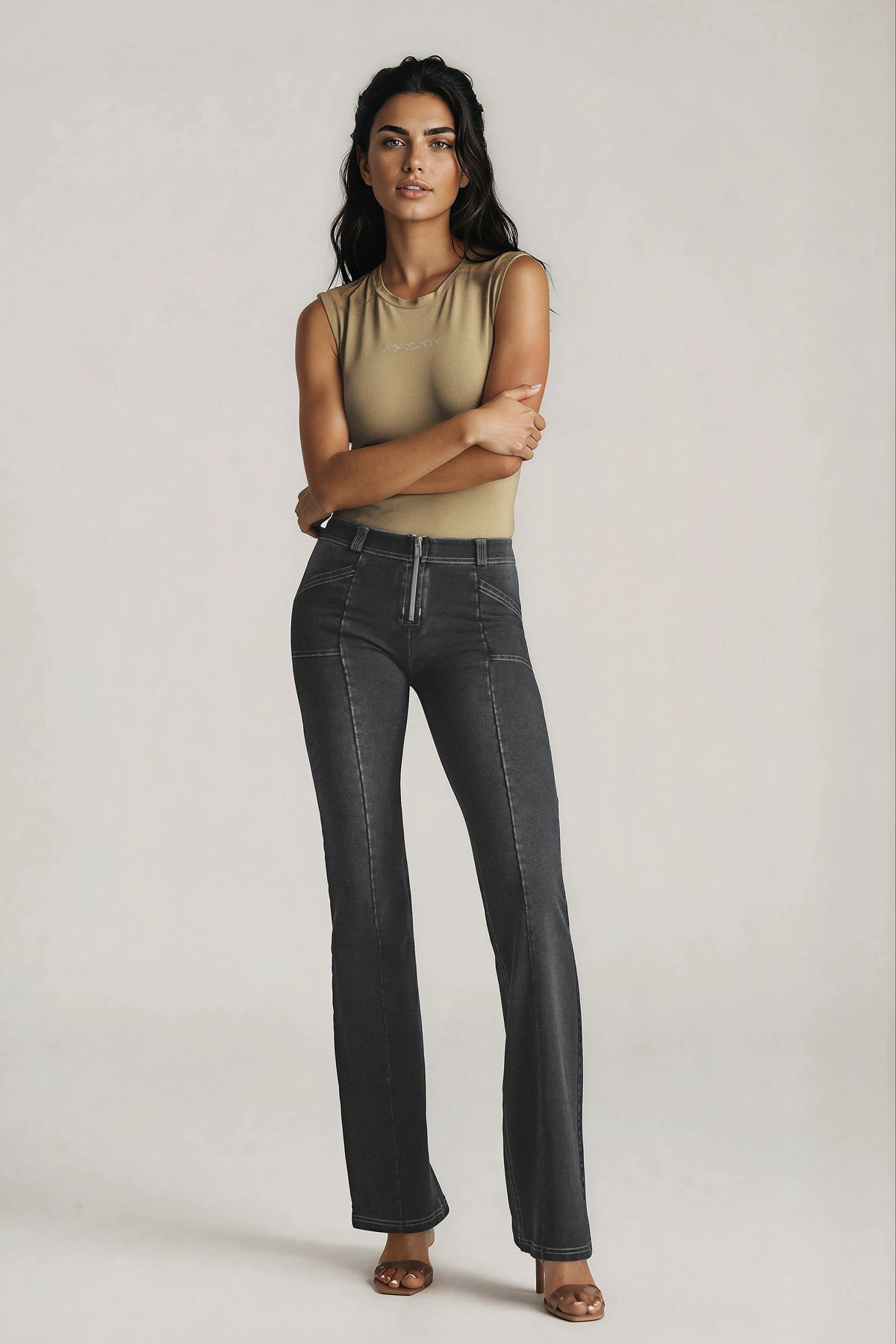 De flared pijpen geven deze jeans een stijlvolle retro vibe, terwijl de stoere details en de opvallende gouden rits een edgy en luxe uitstraling toevoegen. Deze combinatie maakt de broek ideaal voor zowel casual als meer geklede looks. Of je nu kiest voor een paar boots of hakken — deze jeans laat jouw benen optisch langer lijken en geeft je outfit net dat beetje extra.